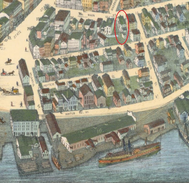 Only one of the banks noted on the map is located on Main Street. This location was near both the center of the city and also only 3 blocks from the dock area. According to the map legend, and noted as building 27, the property on Main Street across from the intersection of Main and Masonic is the Savings Bank of New London. And just to the right of the Bank (which would be north of the Bank as noted in the probate inventory mentioned above) is very possibly the Dickinson home with the small shop in the back.